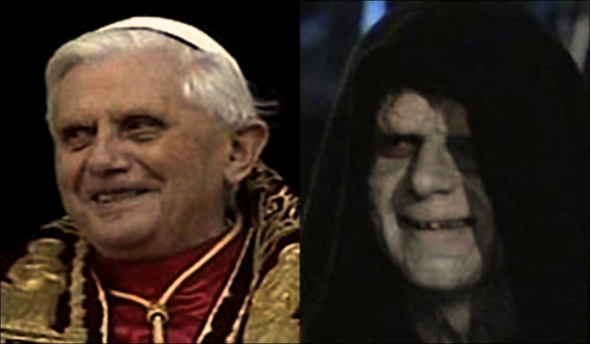 Hello dear, I’m sorry you’re offended – but this is to be taken in the spirit of humor. Pope Benedict’s decision, I am sure, was well reasoned and prayerful, but he certainly has had a papacy troubled by difficult times. My husband was raised Catholic (and the friend he was corresponding with was an altar boy) one of the things I love about him is his depth of humor – and he’s not the first to note the Pope’s unfortunate resemblance to the baddie in “Star Wars”.