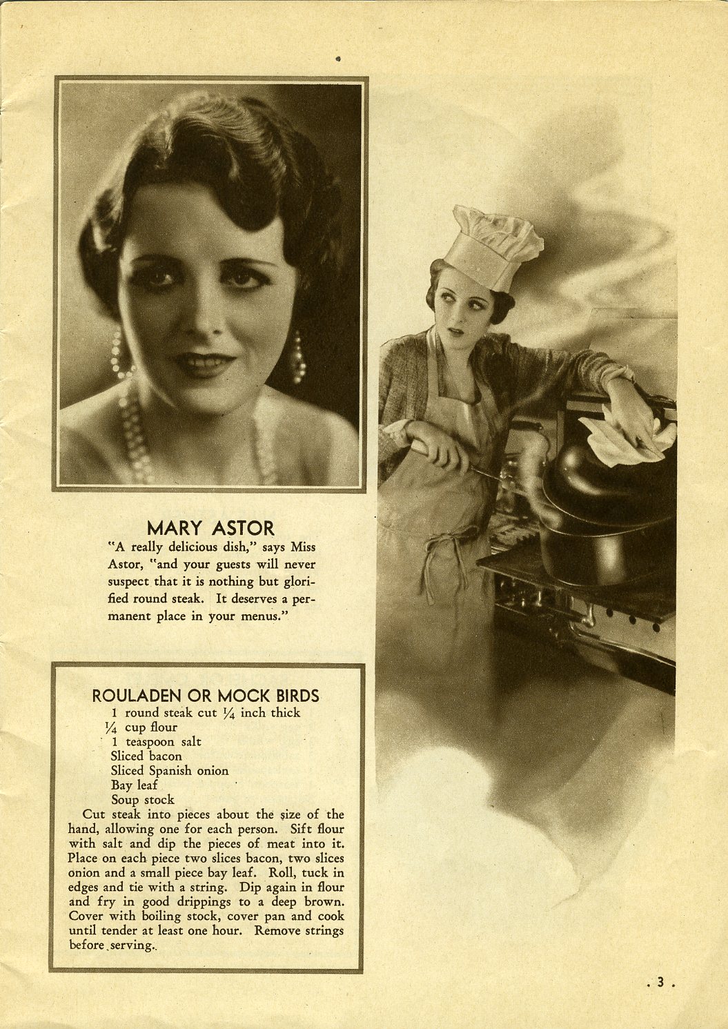 I’ve had something like Mary Astor’s mock birds–only they were made with veal cutlets (back when veal was cheaper). I never got the point of the disguise but they tasted good, and it’s not inconceivable that M.A. knew how to cook.
