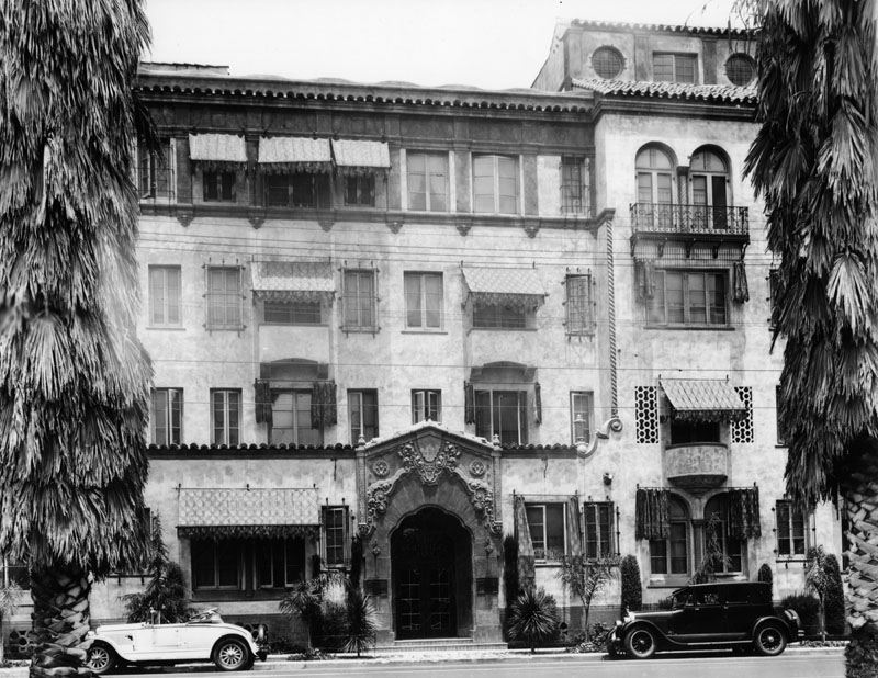 About a block west from Gelson’s market on Franklin, across from the Bourgeois Pig cafe the Villa Carlotta is now painted… an interesting array of hues and surrounded by foliage. The apartment building was designed by Arthur E. Harvey and built in 1926 by Eleanor Ince (Thomas Ince’s widow) for an upscale Hollywood clientele. Former residents include famed director George Cukor and mogul/producer David O’Selznick.